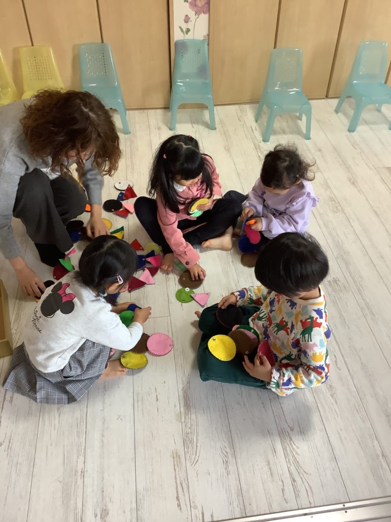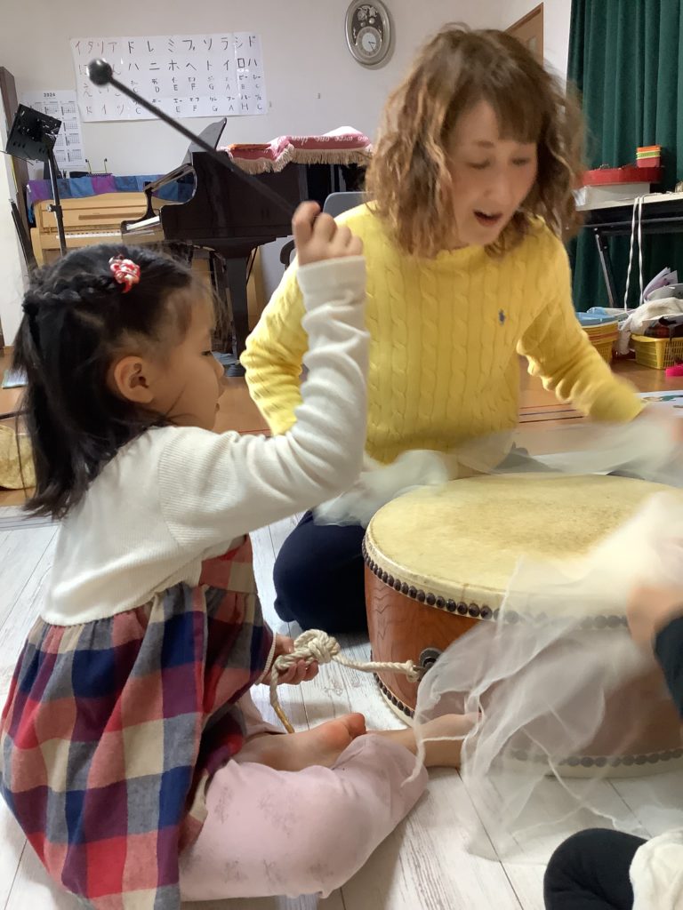 今日の幼稚園音楽クラスでは1月にちなんでお餅つき。太鼓とスカーフで上手にお餅つき。