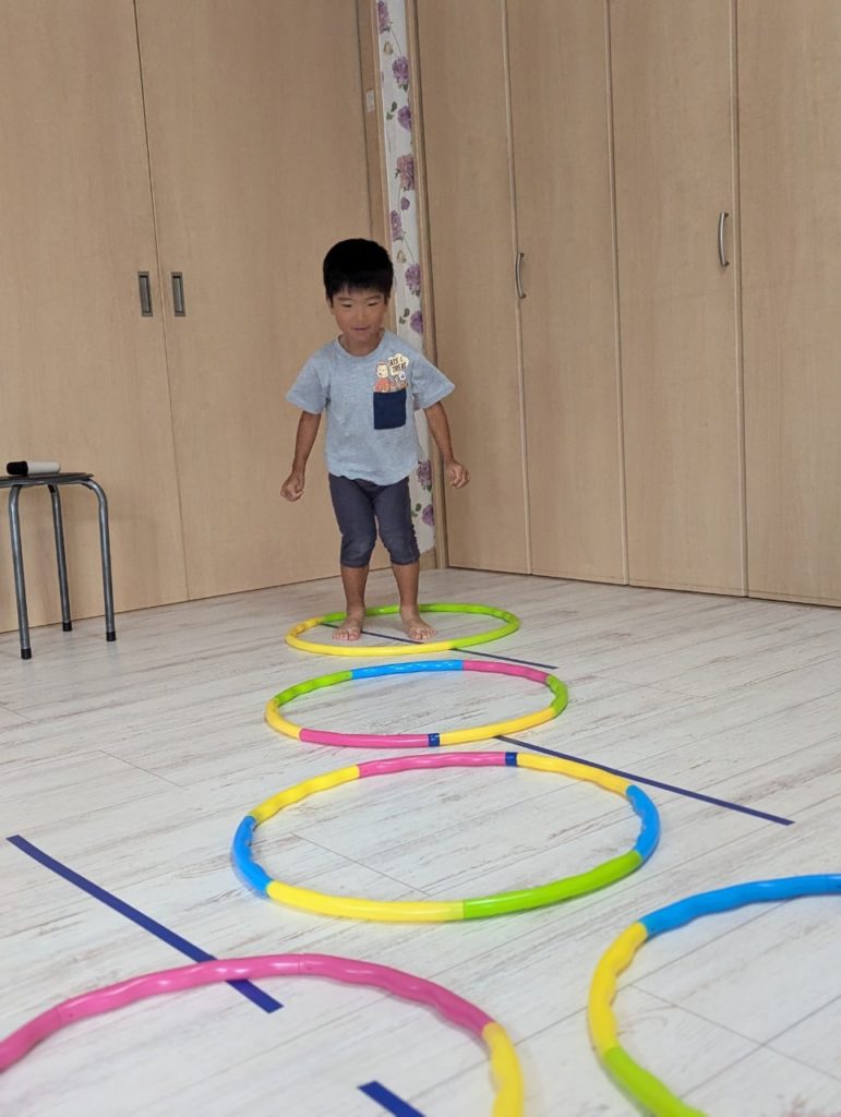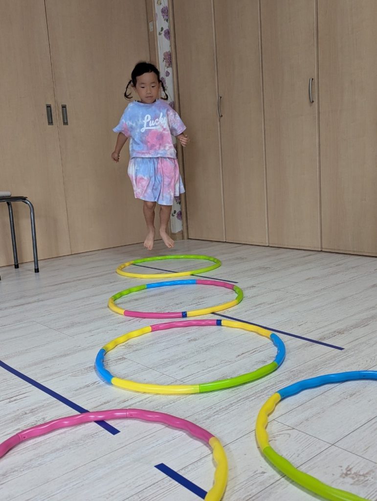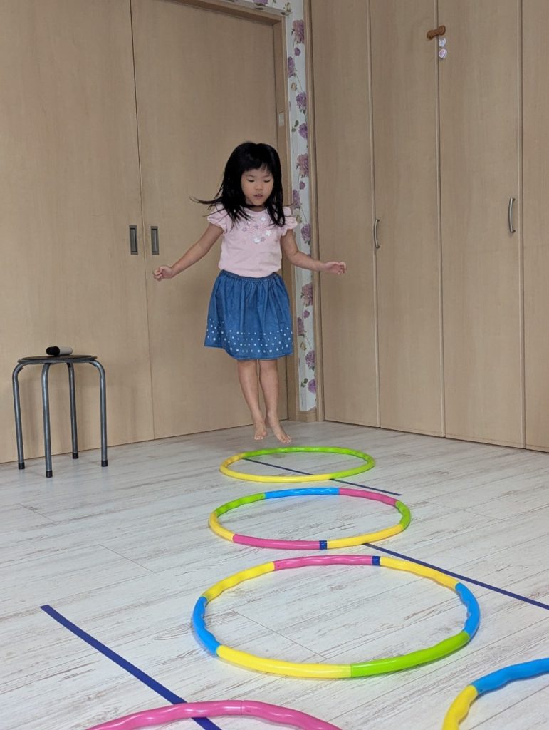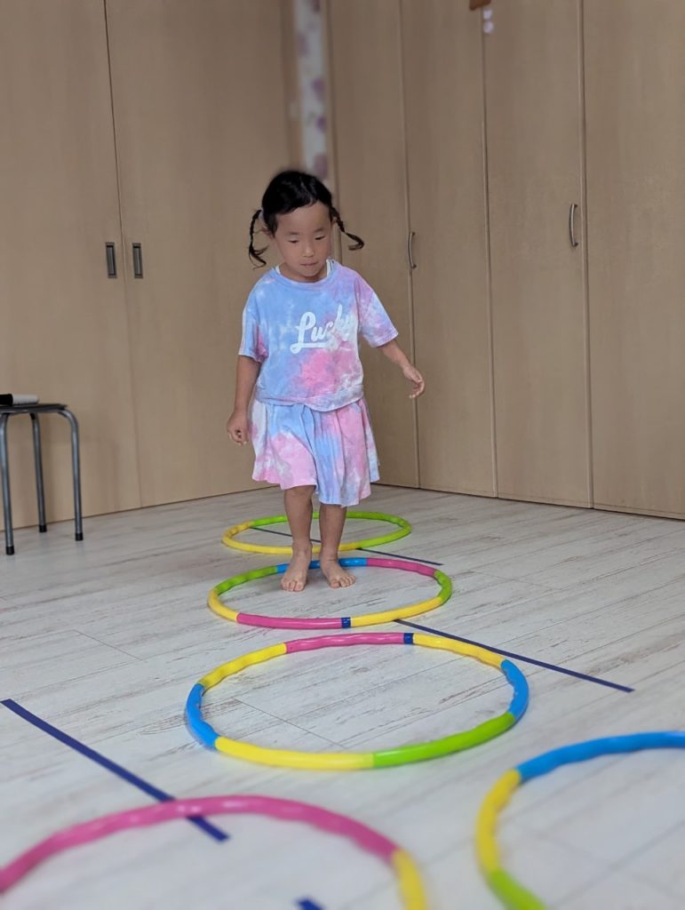 リズム感を体で表現できるようにフラフープを使って音を聴きながらリズム体操を行っています