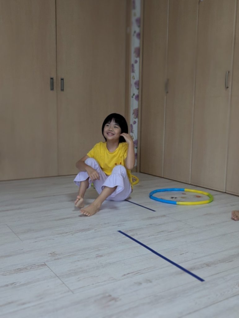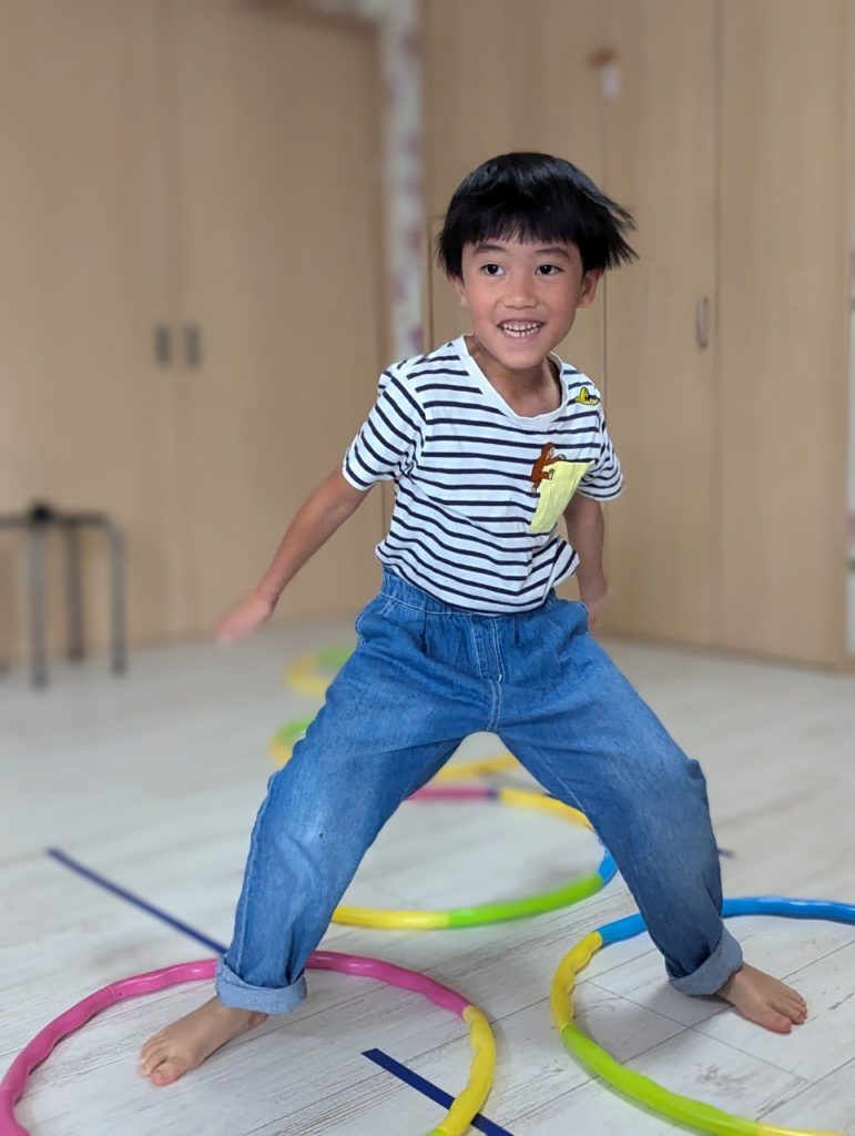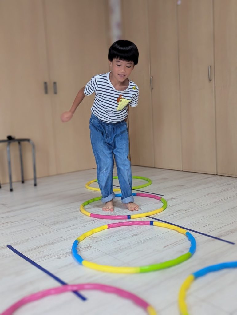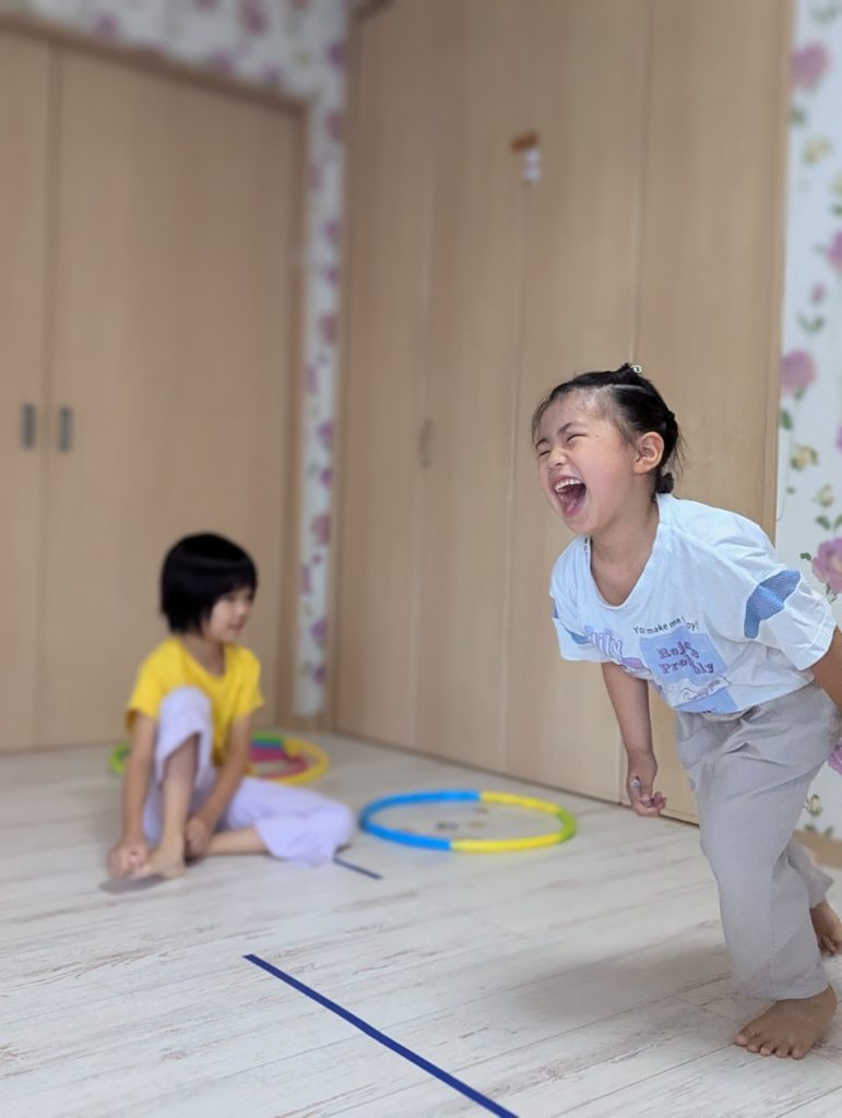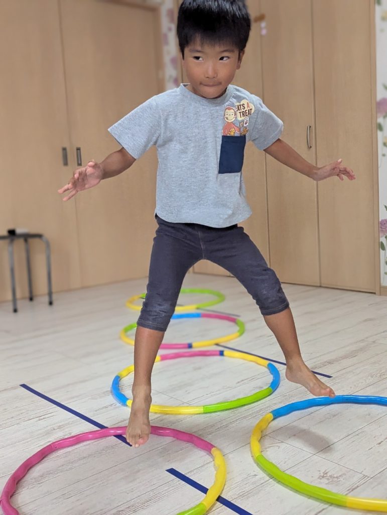 リズム感を体で表現できるようにフラフープを使って音を聴きながらリズム体操を行っています