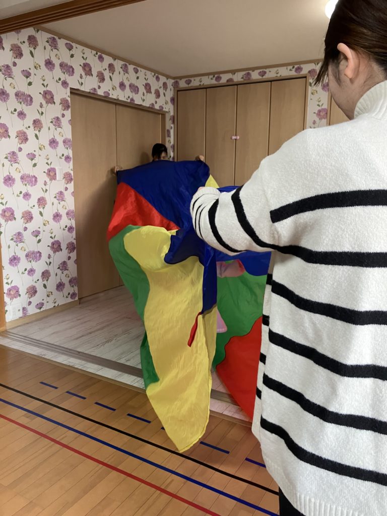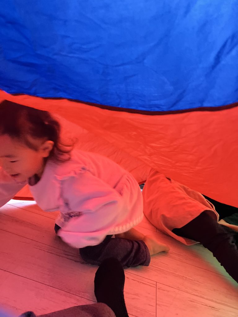 音楽に合わせて中に潜ったり、パラバルーンがトンネルや橋に大変身。終始楽しいパラバルーン活動でした。