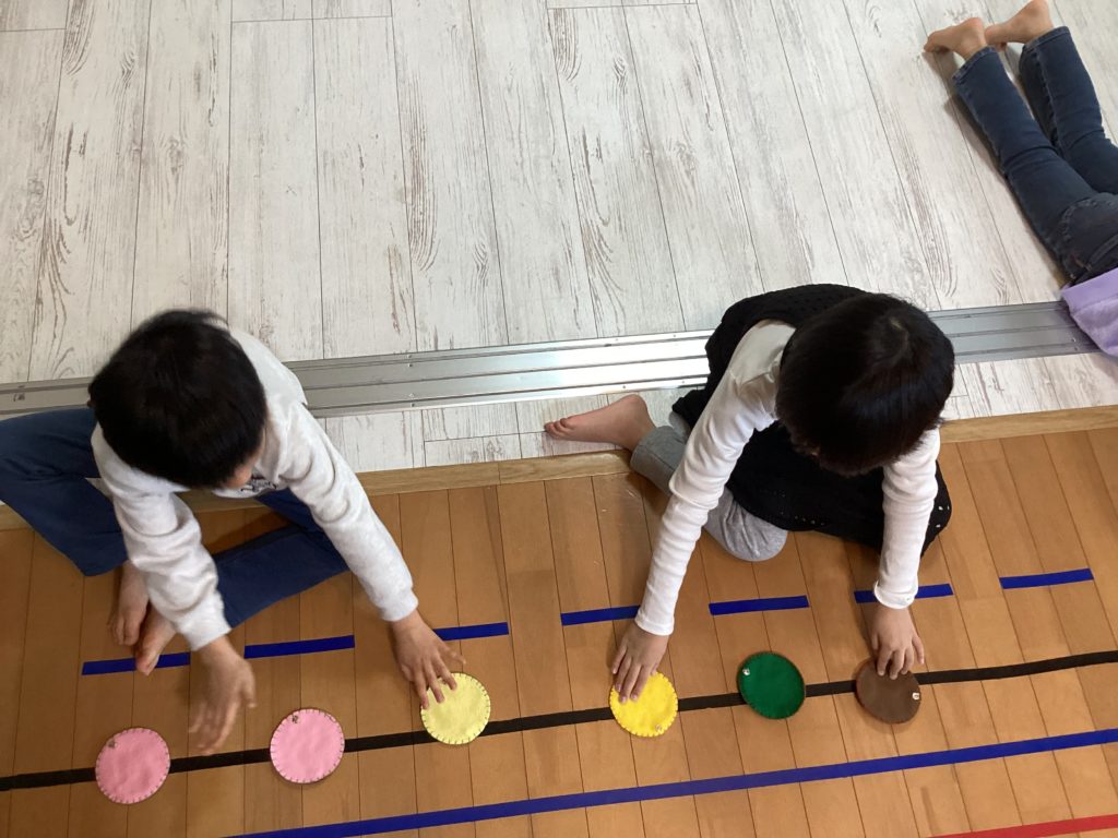 スタッフの手作りのマルフェルト。ボタンもついていて長くつなげることもできるこのマルフェルトを使って音符の読み方練習しています。遊びながら少しずつ身についてほしいと思っています。